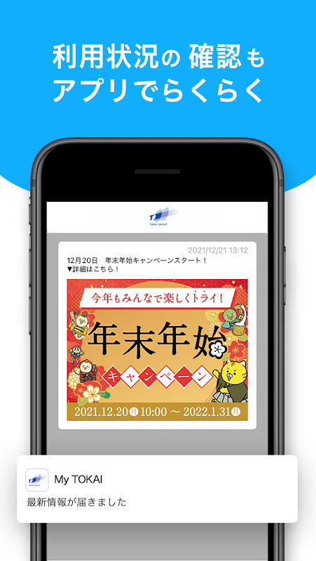 The copyright of the content described in this application belongs to TOKAI Holdings Co., Ltd. Any act such as duplication, quotation, transfer, distribution, reorganization, modification, addition, etc. without permission for any purpose is prohibited. This is the TOKAI Group's My Page App. You can easily check the usage amount, the points you have, etc.