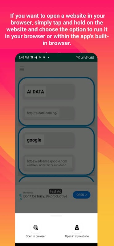 With a simple tap and hold, you can launch your websites directly in your preferred browser or explore them within the app's browser. This allows you to seamlessly switch between browsing options based on your preference and convenience.
