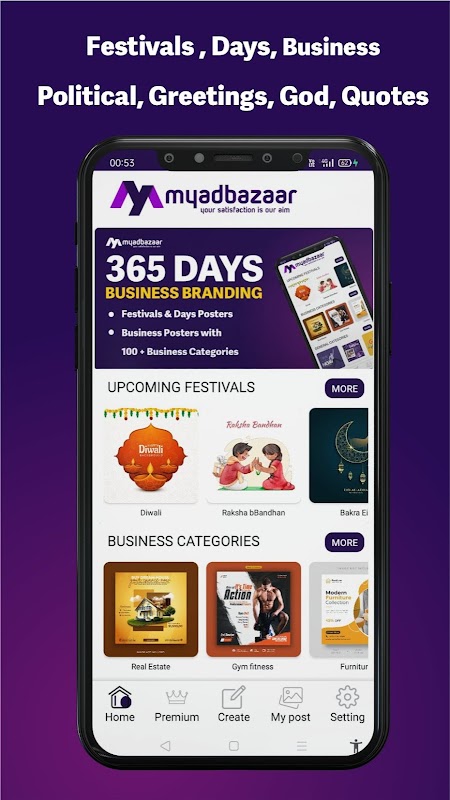 myadbazaar is #1 Indian Festival Poster Maker App helps individual entrepreneur, small enterprise, medium enterprise owner and large corporate companies to designs Daily Post, Jayanti Banners, Sales Flyer, Short Clips, New Service Introduction, Intro Video Maker, Digital Card, Festival Photo Frame, Day Product Promo, Political Election Publicity, Ads Banner, Greeting, Festive Card, Latest Product Launch Promotion & graphics design concept & ideas for digital marketing to promote business.