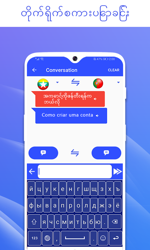 Now user can easily translate Myanmar to English & English to Myanmar and can easily communicate with any one in this world via social media like Face Book, Twitter, V-Chat, WhatsApp & Instagram etc. Here are some specific words used for our English to Myanmar & Cyrillic Translation like Myanmar English translator app, Myanmar English translator free, Myanmar English translator offline, translator English to Zawgyi Myanmar, Translator for all language.