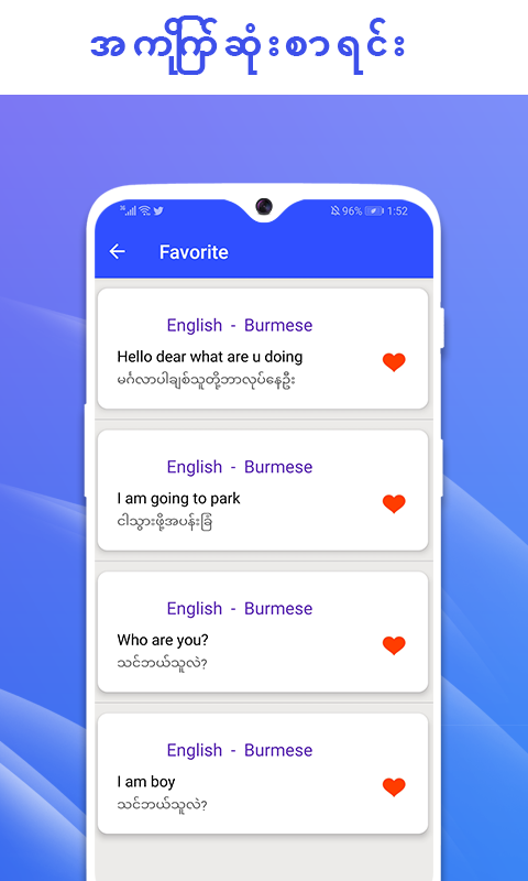 If someone want to memorize vocabulary then must be use new free English Myanmar translation, Myanmar vocabulary or English vocabulary, translate Myanmar to english, English Myanmar dictionary, English Myanmar translation converter. User phone will support voice translator & text translator. Myanmar to English & English Myanmar dictionary is now available for all researcher, students and for travelers, if they want to translate their specific documents in translator without internet or many language, so they now only need native Myanmar or native English speakers, translator from English to Myanmar, English-Myanmar.