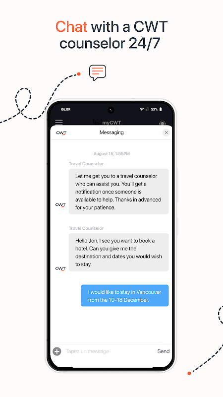 • Chat with a CWT travel counselor through our chat style messaging service