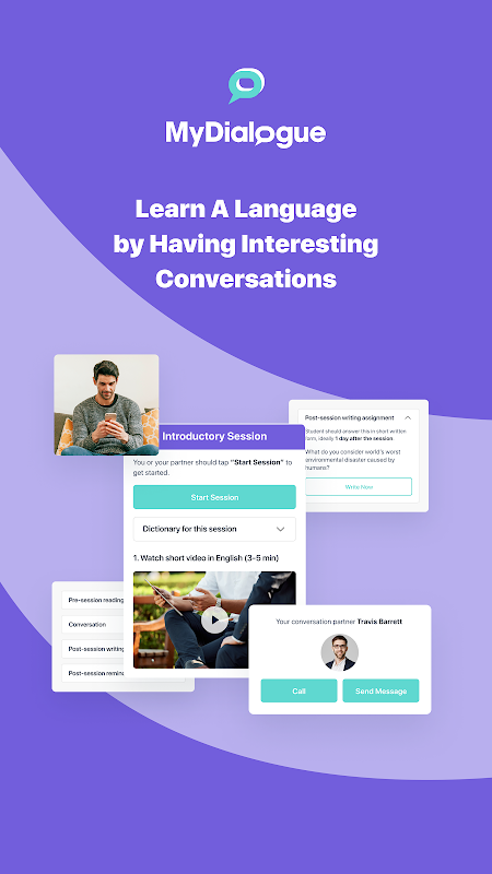 Want to immerse yourself in English and become fluent? Download MyDialogue to undertake a virtual language immersion. MyDialogue’s English course consists of sessions covering varying topics and levels. Each session includes all aspects of language learning, from vocabulary learning and reading to speaking with your conversation partner and a writing task (see pictures). The goal is, through taking a number of different sessions, you will be constantly exposed to new vocabulary and become fluent over time. We know that language learning can be a chore, and MyDialogue changes this by enabling you to learn language through having interesting conversations!