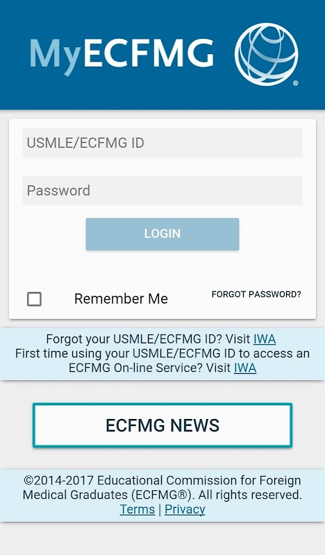 To log in and use the MyECFMG mobile app, you must have your assigned USMLE®/ECFMG identification number and an established ECFMG On-line Services password.