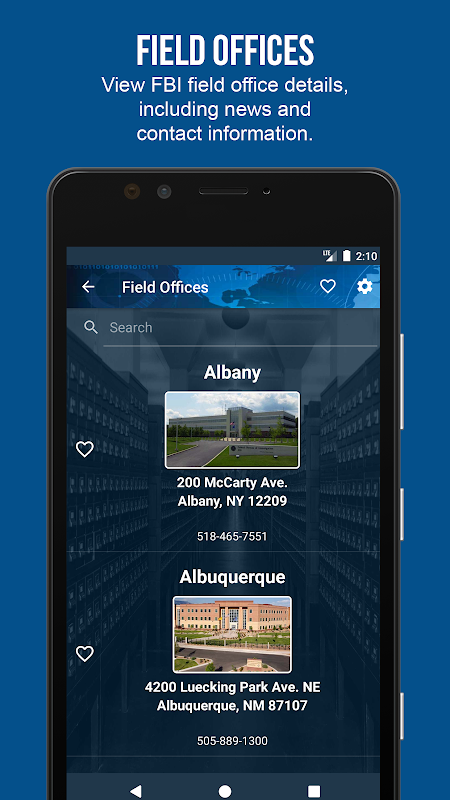 • View FBI field office details, including news and contact information.