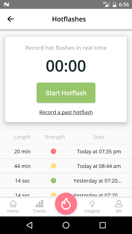 You can track hot flash duration by simply tapping a button to record the start and end time as well as the intensity; Mild, Moderate and Severe.