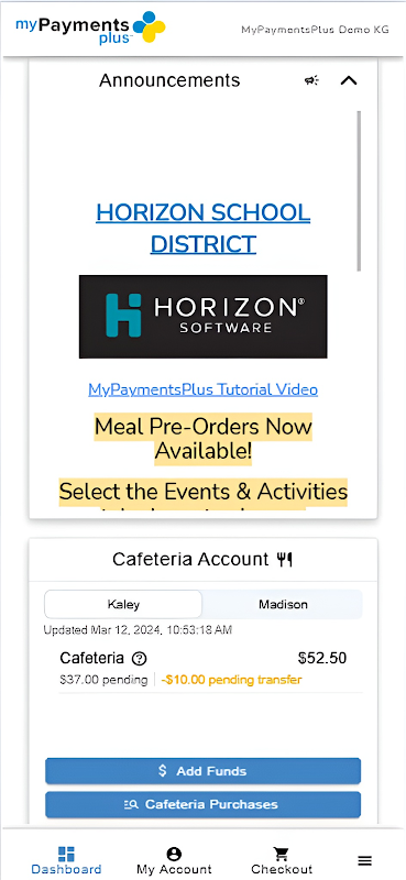 MyPaymentsPlus, powered by Horizon Software International, brings parents and guardians 24/7 access to manage cafeteria accounts for students at participating schools.