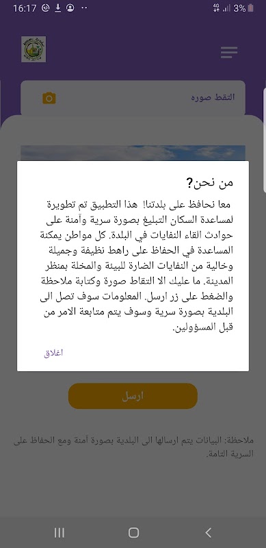 هذا التطبيق تم تطويره لمساعدة السكان التبليغ بصورة سرية وآمنة على حوادث القاء النفايات في البلدة. كل مواطن يمكنة المساعدة في الحفاظ على راهط نظيفة وجميلة وخالية من النفايات الضارة للبيئة والمخلة بمنظر المدينة. ما عليك الا التقاط صورة وكتابة ملاحظة والضغط على زر ارسل. المعلومات سوف تصل الى البلدية بصورة سرية وسوف يتم متابعة الامر من قبل المسؤولين