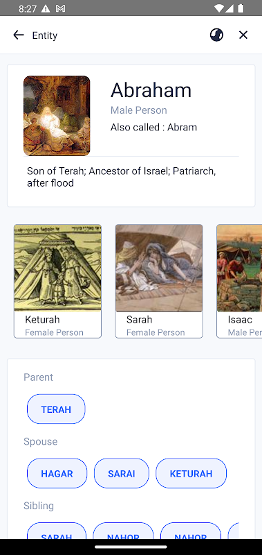 Entity (People, Places, Groups, Events). A knowledge graph of biblical names. Study what the bible says about a person or a location and discover the relationship between them. See what events recorded in the bible of a particular person, or place or group.