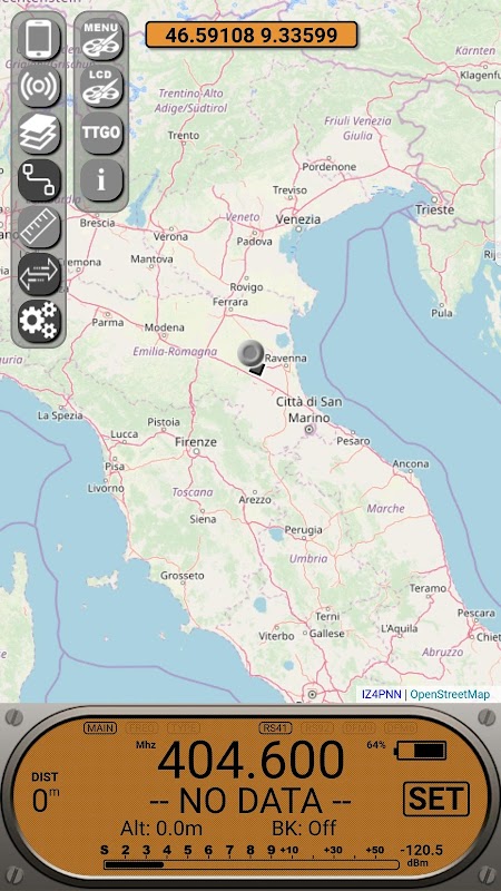 By connecting via Bluetooth to a TTGO Lora 32 (433Mhz) it is able to receive the radio signal directly from the probe, representing in a map the position, the position of the smartphone and all the data received.