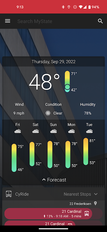 MyState is the ultimate student toolkit to help you get the most out of your adventure at Iowa State. Use MyState to catch the next bus, locate your next class, see what's to eat, quickly find your instructor's office, and much more!
