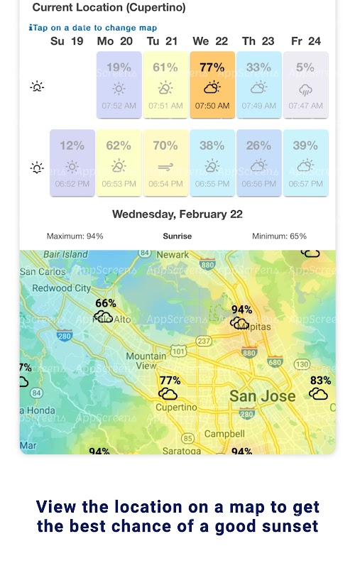 1 - An interactive map with an overlay showing the forecasted quality of upcoming sunrises and sunsets. By default, your current location is shown on the map. On this screen, you can toggle between sunrise and sunset, change the date, move the map around, and zoom in and out of the map.