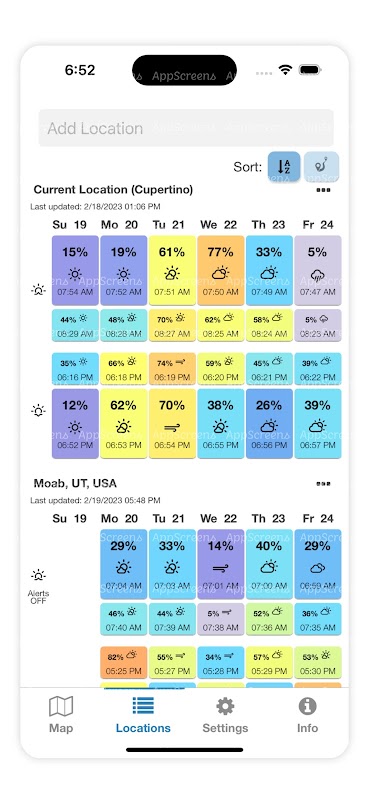 2 - The second screen is a table showing a list of custom locations. Each location displays a forecast percentage, a corresponding color representing the quality of the sunrise/sunset, and the time of the sunrise/sunset. Add as many custom locations as desired.