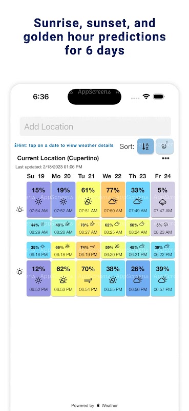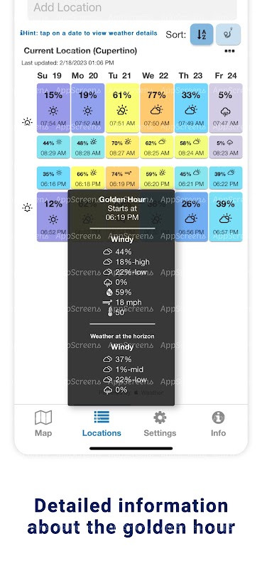 Tap on a day to view weather data for that sunrise/sunset. Even if the sunrise/sunset isn't great, this data is meant to assist in accomplishing your unique artistic goals.