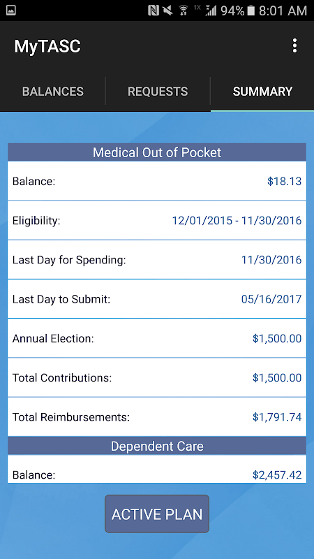 Plan information, plan eligibility dates, last day for spending, last day to submit, annual election amount, and reimbursement and contribution totals.