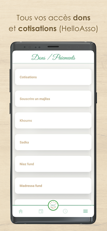 Namaz: The app gives you the Namaz (and Qaza) timetables directly. Subscribe to Namaz Alerts to be notified during Namaz hours with notifications.
