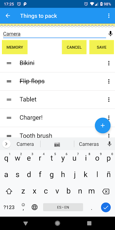 Another option for not typing much and saving time is to use the memory: the app will remember what you wrote in the past and will show you a list of items that you can select and add to your list. You can edit the memory to keep only the items you need.