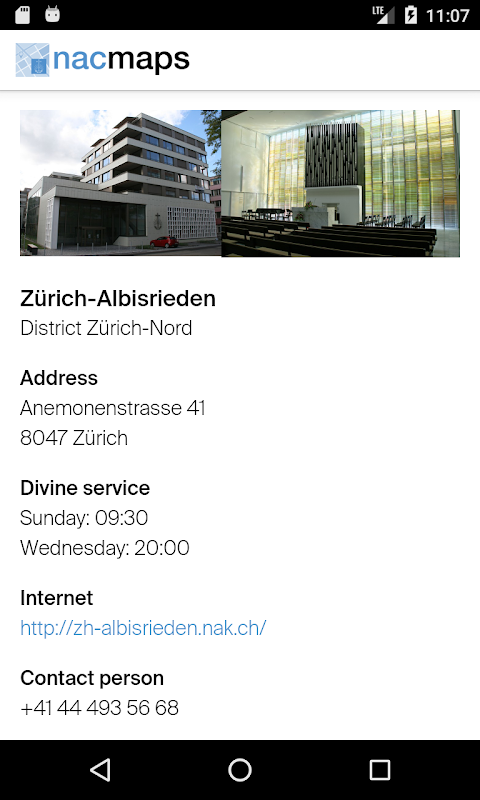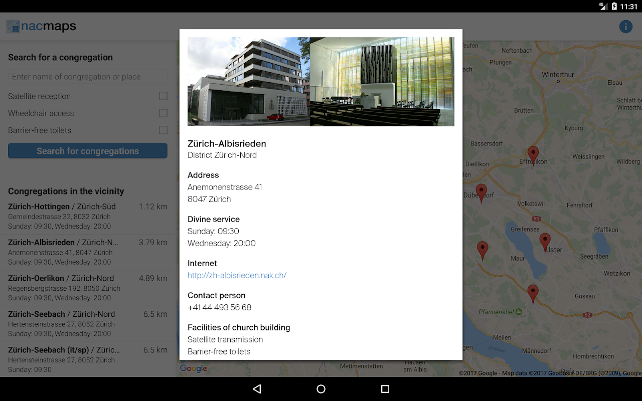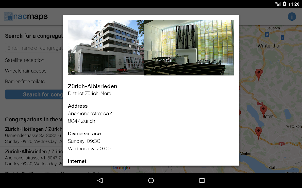 nacmaps is an app that offers convenient access to addresses and contact information of New Apostolic congregations around the world. The app makes it easy to find New Apostolic congregations in the immediate vicinity as well as congregations in certain cities and countries. The congregations are displayed in list or map views. After selecting a congregation, the congregational website can be accessed, the contact person called, or directions started via installed navigation apps. nacmaps is ad-free and free of charge.