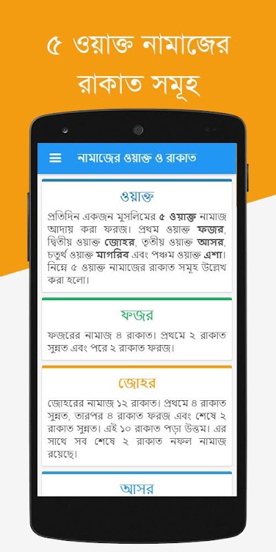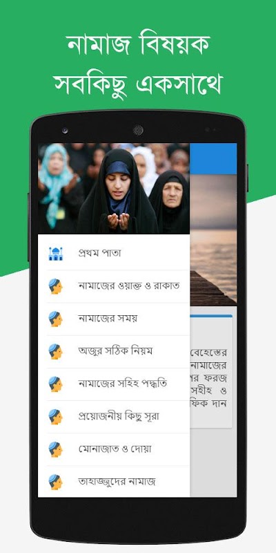নামাজ বিষয়ক পূর্ণাঙ্গ একটি অ্যাপ। এতে রয়েছে, নামাজের ওয়াক্ত ও রাকাত, নামাজের সময়, অজু করার সঠিক নিয়ম, নামাজ পড়ার সহিহ পদ্ধতি, সহজে মনে রাখার মত কিছু প্রয়োজনীয় ছোট সূরা এবং বেশ কিছু গুরুত্বপূর্ণ মোনাজাত ও দোয়া। সাথে রয়েছে তাজাজ্জুদের নামাজ পড়ার সময়, রাকাত ও সঠিক নিয়ম। অর্থাৎ নামাজ এবং নামাজের শুরু থেকে শেষ পর্যন্ত সকল কিছুর সহিহ ও সঠিক তথ্য এই অ্যাপটিতে রয়েছে।
