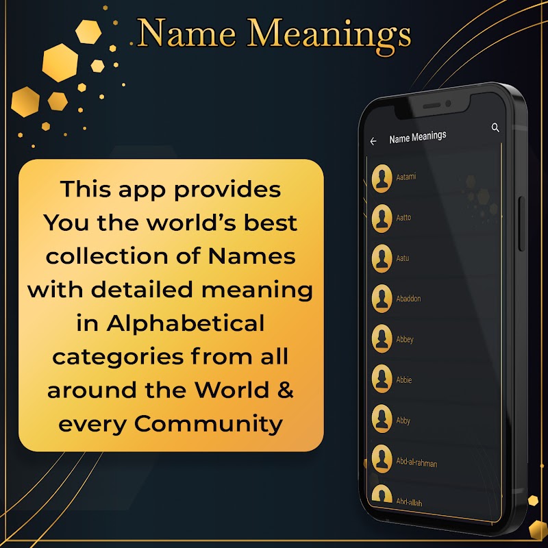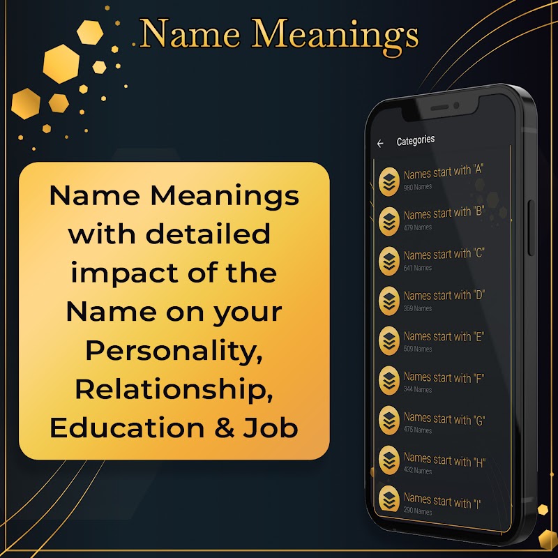 Name Meanings is an all in one name dictionary app for you to help you in finding true name meanings with its impact on your personality, life, relationship, education and job. Name Meanings is the best names app to share meanings of the name and its origin with your friends and family from 11,000+ popular and unique names in alphabetical categories from all over the world and from every community.