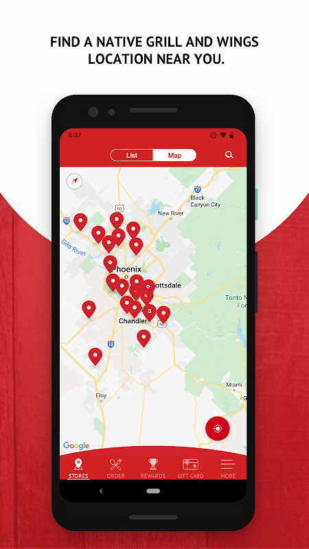 -Map view- Uses your phones GPS to find the closest Native Grill & Wings store location.