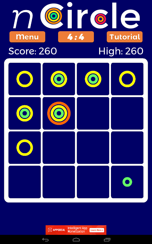 nCircle is an exciting puzzle game that requires you to smartly combine and merge circles in order to rack up points. Swipe up/down/left/right to move and combine circles. Small circles merge into larger ones. Circles of the same size are combined to make a larger circle. In order to be combined, both circles must contain each smaller size circle. Combining two full size circles clears them from the board. Be careful though, a new circle of random size is added after each move. Once the board fills up with circles that can't be combined, the game is over.