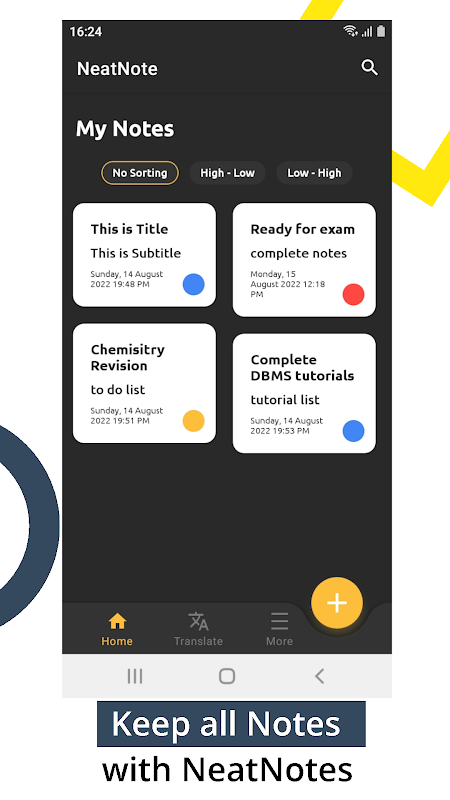 You just launch this application, this application gives you the better user interface with color full buttons and easy to use editor screen. Neatnote - notepad with translator is easy to create , add and update notes with few taps.
