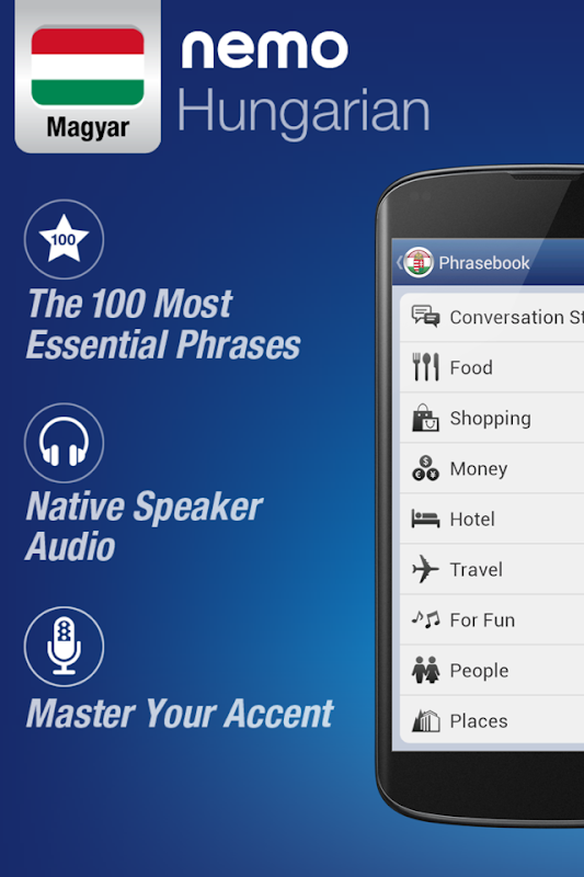 Nemo is designed to start you speaking the most useful words in Hungarian immediately and confidently. With millions of downloads from around the world, Nemo is now available for Android phones and tablets.