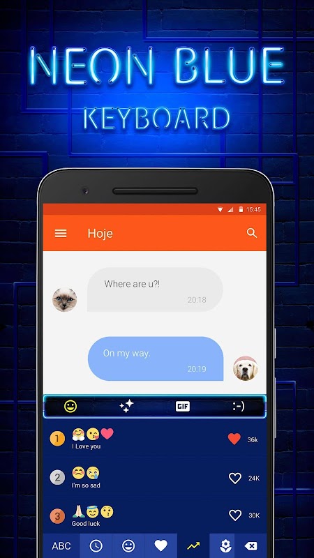 This Neon Blue Keyboard Theme uses Facemoji Keyboard Facemoji Keyboard + GIFS. Please click the link to have it installed first.