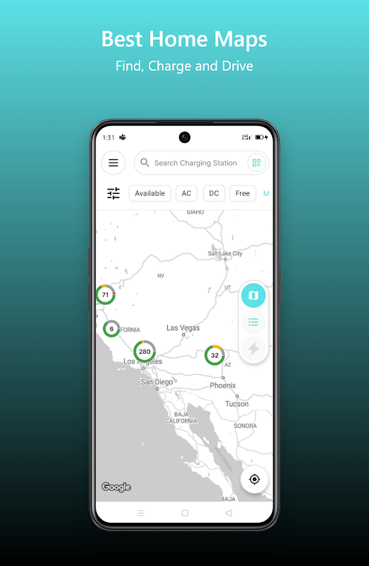 - Default Map with site cluster and with port status: The map view displays charging ports as clusters, making it easier to find the nearest one.