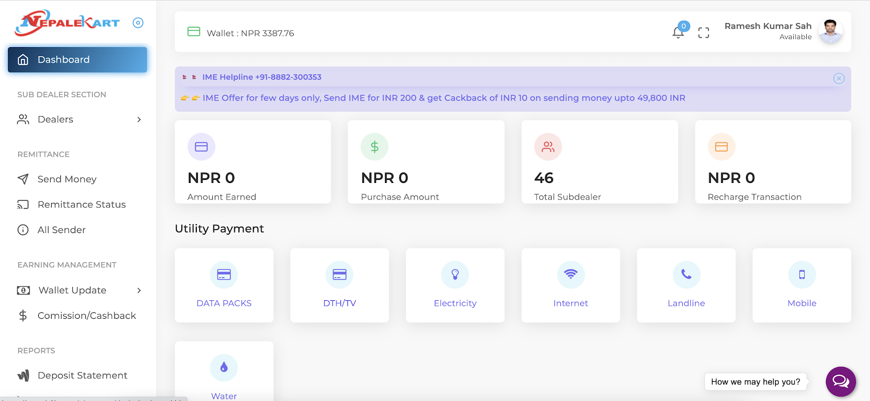 Through Nepalekart Dealer App your can make payment of various operators of Nepal, & also can send money to Nepal through IME/Prabhu Money
