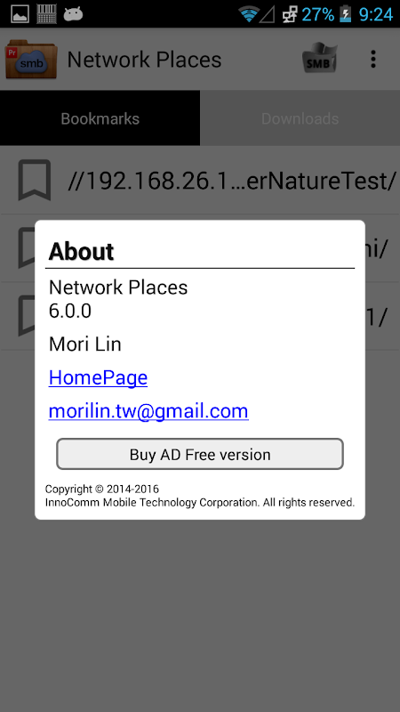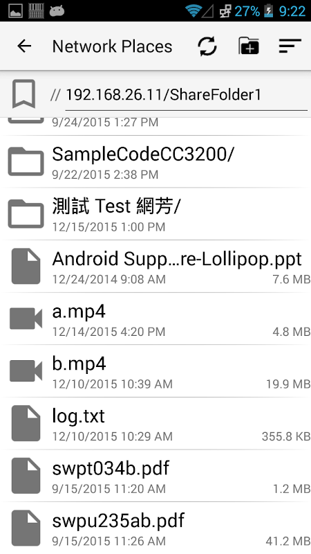 SMB (Samba/CIFS) client for Android devices. It allows connecting to shared folders hosted on Windows or Samba servers over Wifi. It allows managing several connections with authentication. It comes with both a device file browser and a SMB file browser. It provides download support for files and folders. You can rename, delete, and view media files. Browse and transfer intents are available for third party applications. Root access is not needed.