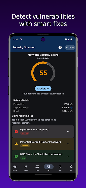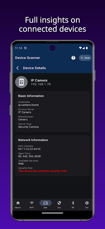 Find network devices, check WiFi security & monitor Bluetooth connections.