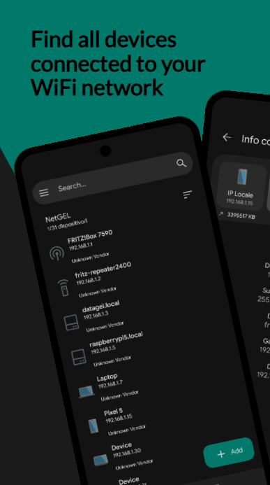 Scan and analyze your network in real time, identifying all connected devices. Get detailed information for each device: