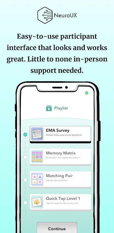Traditional randomised controlled trials (RCTs) often do not adequately capture change during treatment, largely due to limitation inherent to RCT methodology. One such limitation is the use of infrequently administered outcome assessments, which do not have the precision to predict or measure outcomes. These measures often do not possess the temporal resolution necessary to assess individual-level change in neurobehavioral symptoms that vary by time and context (e.g., cognitive performance different at home vs. in the clinic). The NeuroUX app is designed to make it easier for researchers to use mobile technologies to study cognitive processes over time, in the “real world.” Our platform is currently being used in several federally-funded studies, including RCTs. The NeuroUX app supports: