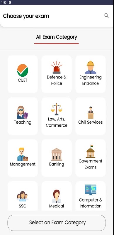 Explore a comprehensive test series, navigate multiple exams using a user-friendly search and selection feature, all conveniently accessible on a single screen.