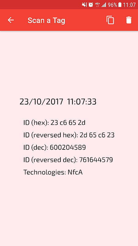 To use NFC Reader, you have just to hold a tag or a card against the back of your device to read it. NFC Reader lets you to copy the content of the tag or to open the URI. You can also manage the tags and cards previously scanned in the History section.