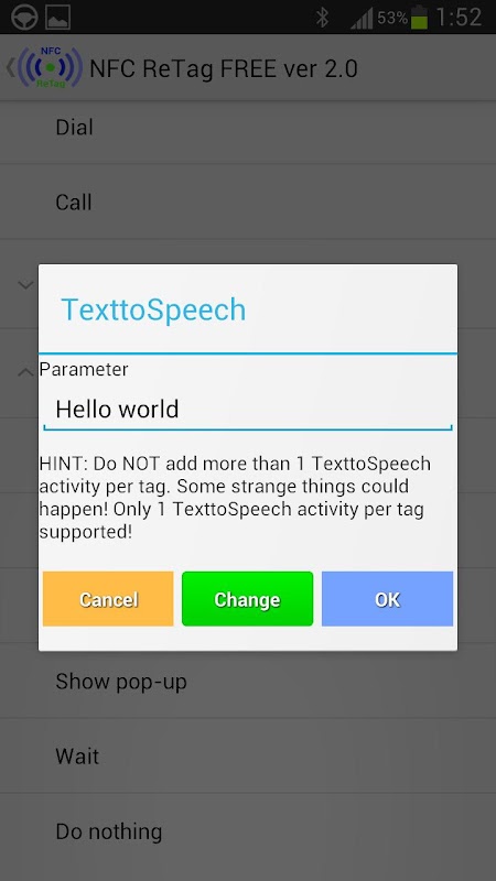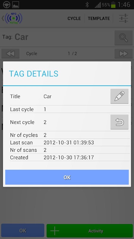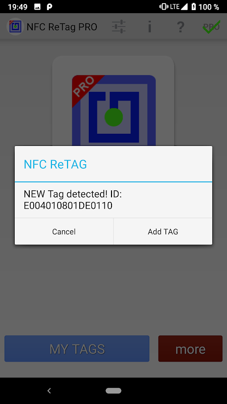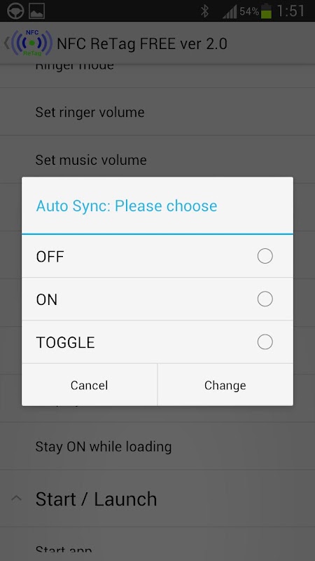 You can use this app to associate multiple functions (e.g. Wlan OFF, Bluetooth ON, Mobile Data TOGGLE, start navigation,run Tasker task, start any installed app, use media buttons, call a phone number, add a timestamp, calendar entry, add Text-to-Speech and much more!) to a NFC (near field communication) tag via an app internal database. You can even add tag cycles and let your tag run different activities per scan. So ReTag is the perfect NFC automation tool for you ;-).