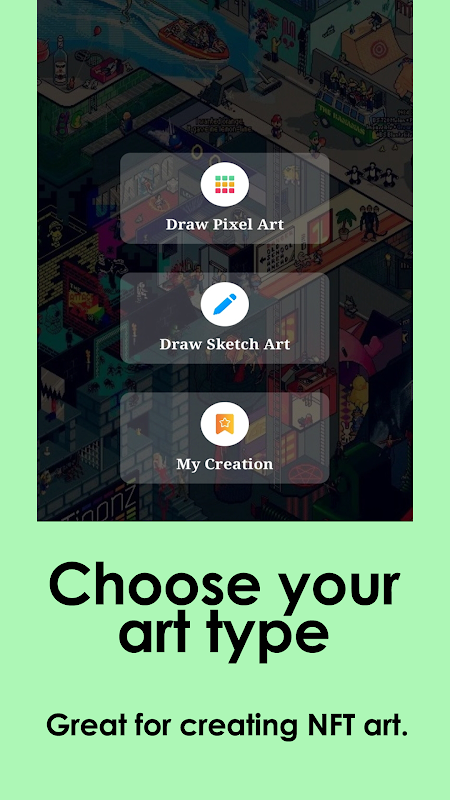 NFT maker is the tool for creators! You can now create your own NFTs in Pixel form and drawing form. With the many tools and easy process, you don't need any drawing or programming skills. Never have to worry about not having a gift to give again.