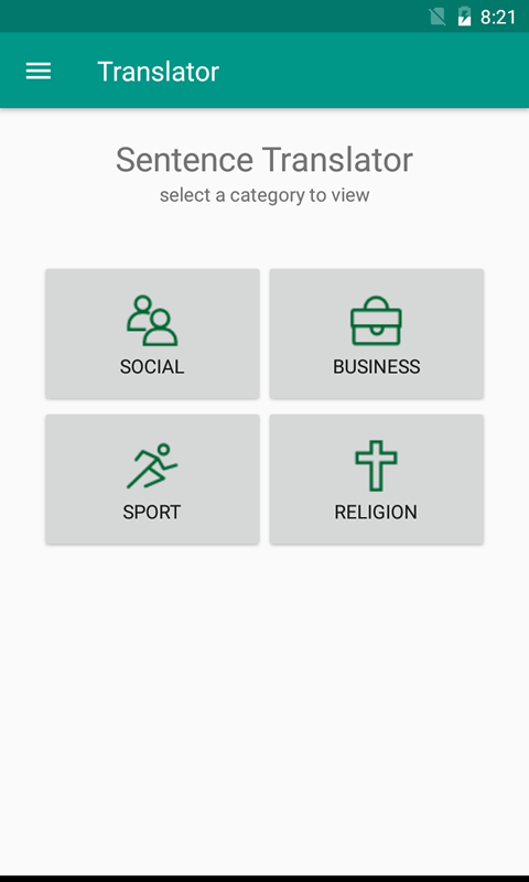 ➻Sentence Translator - Direct translation from English to pidgin in four categories; Social, Business, Religion and Sport