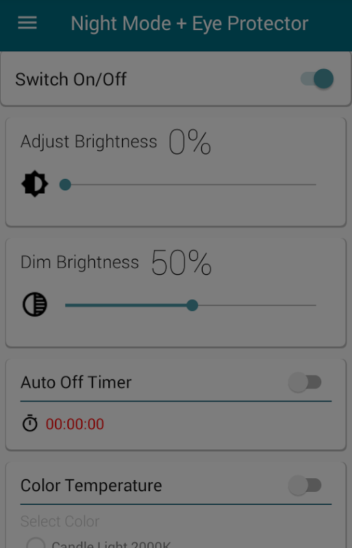 Night Mode + Eye Protector main goal is to reduce the brightness of your screen lower than you can achieve with the default settings. This application applies an overlay filter that acts as a dimmer to darken the screen. It helps to avoid headache and eye pain in a dark environment or at night .