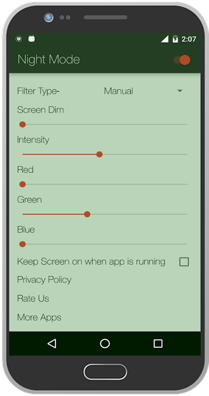 Reading Mode filter is used to reduce blue light by adjusting the screen to natural color. Keep Screen on when app is running help when