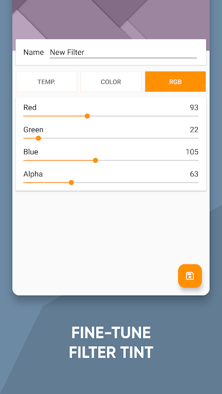 📊 RGB customization - Set the amount you wish of the red, green, or blue color in your filter and how much you want the screen to become dimly lit. Create your night filter.