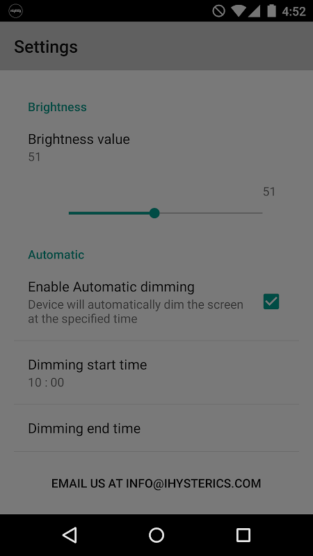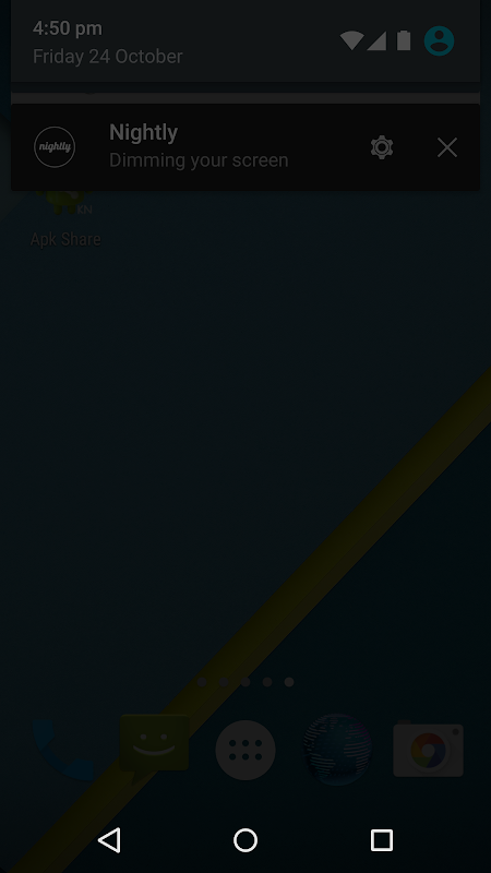 Enable automatic dimming at specified time. For example set the nightly dimming time at 10:00 PM and the app will automatically dim the brightness. If you don't want to dim just click on the app icon or (X) button on the notification the dimming stops