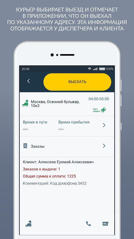 Выезд к клиенту является одним из удобных для клиента вариантов взаимодействия с химчисткой. Приложение АГБИС КУРЬЕР создано, чтобы автоматизировать работу выезда. Оно позволяет формировать очередь адресов для водителя, строить маршрут поездки, контролировать успеваемость к назначенному времени, связываться с клиентом. Через приложение возможно оформление предварительного заказа, прием оплат, вывод квитанции на чековый принтер и многое другое.