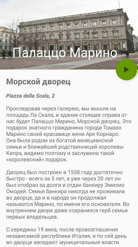 De route gaat door de Piazza handel (het hart van de middeleeuwse Mediolanum), haar perfect bewaard gebleven loggia Delli Uzziah de 14e eeuw en een juridisch adviseur. Kasteel Sforzesco en het Sempione Park - het stadspark, die het Paleis van Kunsten en Branca Tower herbergt. En op het einde van de tour - de Arc de Triomphe, de zogenaamde Peace Arch in het geheugen van de wereld die we hebben in 1815 opgebouwd in Europa na de val van het rijk van Napoleon.