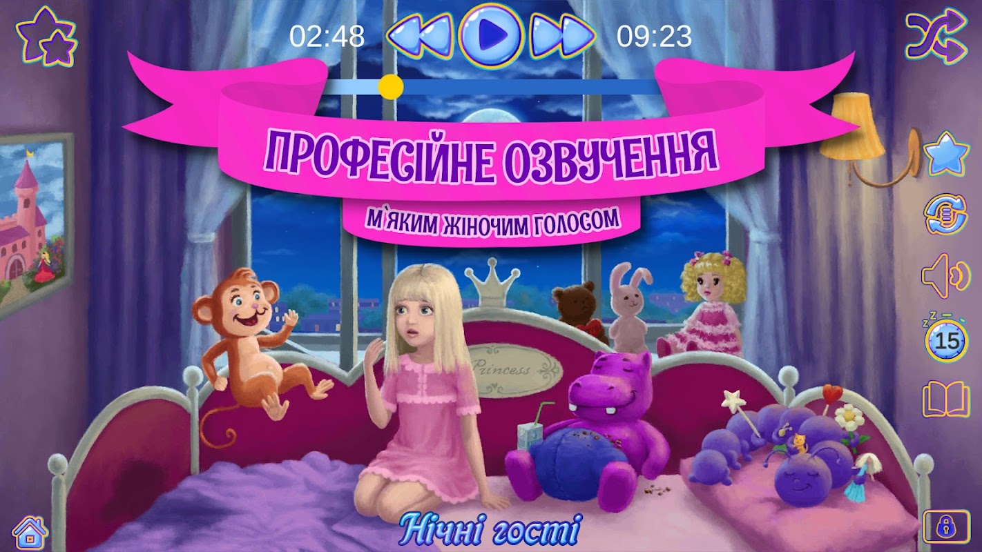 Naast het audiosprookje kun je ook het kinderliedje en witte ruis aanzetten: het geluid van krekels en het geluid van regen met onweer. Het volume van elke audiotrack kan afzonderlijk worden aangepast. Sprookjes worden voorgelezen met een aangename, zachte vrouwenstem die uw kind zal kalmeren en in slaap wiegen. De meeste audiosprookjes hebben zelfs slaapliedjes. Dergelijke verhalen zijn gemarkeerd met een notitiepictogram op het hoofdscherm van de applicatie.