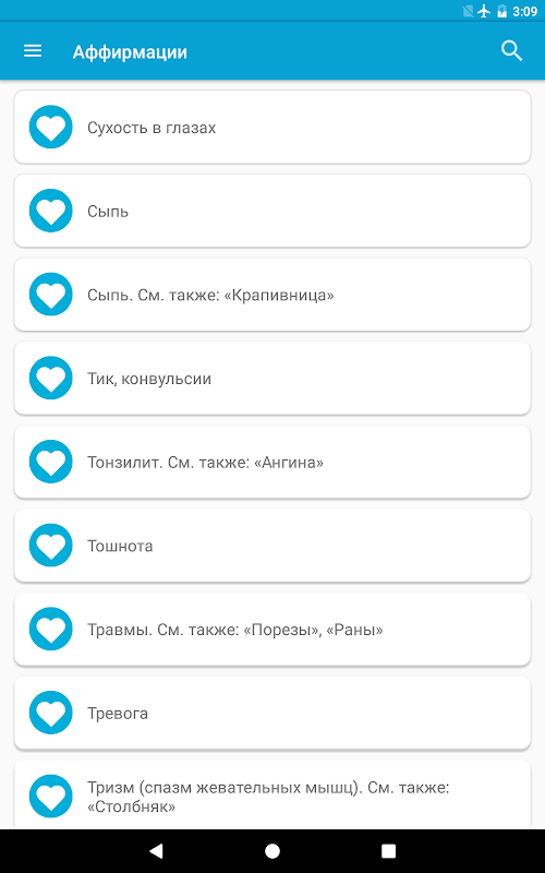 Данное приложение позволит Вам в нужный момент находить информацию по интересующему заболеванию. А благодаря возможности добавлять болезни в избранное, Вы сможете быстро и удобно открыть нужные аффирмации для повторения.