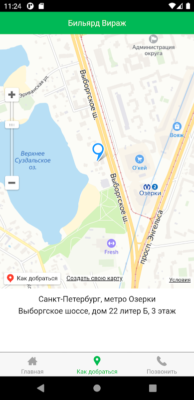 Biljart Virage toepassing zal u toelaten om vertrouwd te raken met basisinformatie over Virage biljartzaal in St. Petersburg te worden.