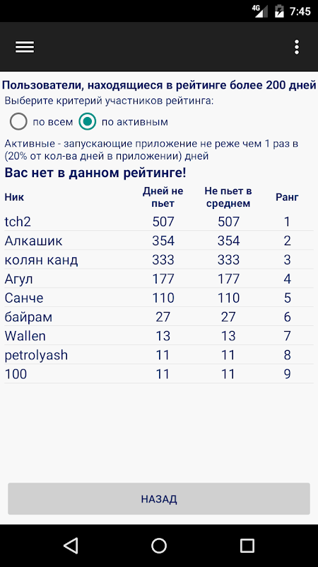 Также, Вы увидите, что Вы не одни в Вашем желании бросить пить, возможно, люди, находящиеся в рейтинге приложения, даже ближе Вам по жизненным взглядам чем Ваши текущие друзья/собутыльники.